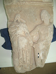 | Description: | Part of top surface, with projecting molding above sculptured face, preserved. Two figures standing facing; to the right a nude bearded male, his right hand on his hip, his left shoulder raised, and his body twisted in a pronounced double curve; face, most of his left side, and legs below knees, broken away. To the left, a female figure wrapped in an ample himation; raised right arm broken away; the head, which was doweled on, is missing, and the legs are broken off below the knees. Pentelic marble. | |