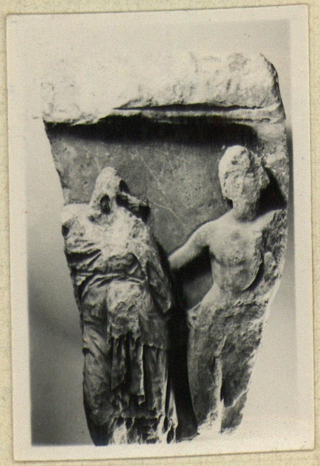 | Description: | Part of top surface, with projecting molding above sculptured face, preserved. Two figures standing facing; to the right a nude bearded male, his right hand on his hip, his left shoulder raised, and his body twisted in a pronounced double curve; face, most of his left side, and legs below knees, broken away. To the left, a female figure wrapped in an ample himation; raised right arm broken away; the head, which was doweled on, is missing, and the legs are broken off below the knees. Pentelic marble. | |