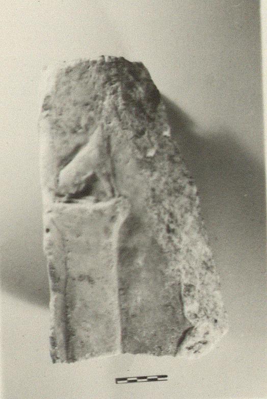 | Description: | Broken at right and below; back, sides and top rough-picked. A dog of hound type seated right upon a column; trace of some other representation at lower right. Pentelic marble. | |