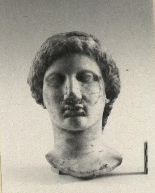 | Description: | Complete save minor chips. Cut away flat behind as if for attachment to wall. An iron dowel passing from the crown of the head diagonally out to the flat surface has split the marble on the top. Neck finished below for insertion to a statue. Female head, about half life-size, the hair rolled back from the face and falling to the neck at the left side. Ears pierced for earrings. Flesh surfaces carefully finished. Abundant traces of gilding about mouth and nose, on cheeks, eyes, ears, hair, etc. Pentelic (?) marble. Drilled for setting on base December 1960. The iron pin set through the top of the head had rusted and cracked the marble. The two pieces were therefore taken apart and the iron pin removed. It proved to be a square bar set in lead in a round drilled hole. The pin was clearly set from the point of the head entering at the back of the headband and running down towards the back at a steep angle. The lower end of the bar as we found it appears to be an original end. It stopped just short of the flattened back of the marble. The upper end apparently projected from the head and had been broken off in antiquity (H. A. Thompson, 1 May 1954). | |