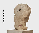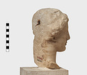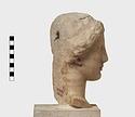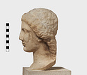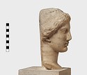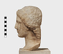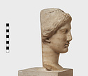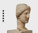 | Description: | Complete save minor chips. Cut away flat behind as if for attachment to wall. An iron dowel passing from the crown of the head diagonally out to the flat surface has split the marble on the top. Neck finished below for insertion to a statue. Female head, about half life-size, the hair rolled back from the face and falling to the neck at the left side. Ears pierced for earrings. Flesh surfaces carefully finished. Abundant traces of gilding about mouth and nose, on cheeks, eyes, ears, hair, etc. Pentelic (?) marble. Drilled for setting on base December 1960. The iron pin set through the top of the head had rusted and cracked the marble. The two pieces were therefore taken apart and the iron pin removed. It proved to be a square bar set in lead in a round drilled hole. The pin was clearly set from the point of the head entering at the back of the headband and running down towards the back at a steep angle. The lower end of the bar as we found it appears to be an original end. It stopped just short of the flattened back of the marble. The upper end apparently projected from the head and had been broken off in antiquity (H. A. Thompson, 1 May 1954). | |