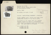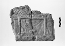 | Description: | Rough-picked back, bottom and right side preserved; broken at top and at left. Preserved is the lower part of a seated figure, right; in front, a sacrificial table with six pyramidal cakes and one round one. At left, part of a snake. Pentelic marble. Cf. S 1229 (ΟΟ 30). | |