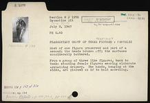 | Description: | Most of one figure preserved and part of a second; the heads broken off; the surfaces considerably battered. From a group of three like female figures, standing back to back, wearing elaborate archaizing drapery. The hands, hanging at the sides, are pierced as if to hold something. Pentelic marble. | |