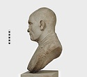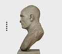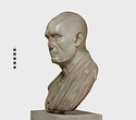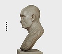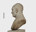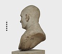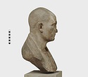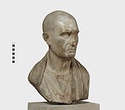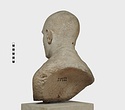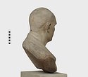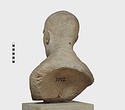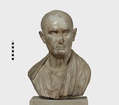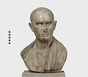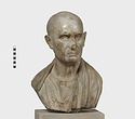 | Description: | Complete except for chipped nose, and base. Draped bust, wearing tunic and cloak. An elderly man; the bald head has a close-clipped fringe of hair; the features are heavily lined. Point of juncture with tongue for base 0.16m. side. The highly crystalline marble has a grayish cast. It had been brought to a high finish on the flesh surface, in contrast with the matte finish of the hair and the drapery. Island marble. Drilled for setting, two holes in lower edge of bust, June 1958. | |