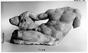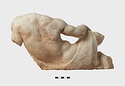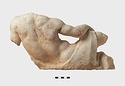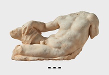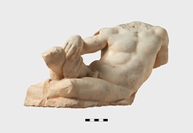 | Description: | Complete from just below knees to neck; two large chips, flaked off from the upper right arm, mended (old break, caused by a hole between them). Left arm missing. A hole in the broken surface at the neck apparently served for the attachment of the head. Male figure, reclining on left side, in the pose of the Ilissos of the Parthenon pediment. Scale about one quarter life. Drapery over right thigh; muscles prominently indicated. Base, a shallow plinth, rough-worked on the bottom. Of Herakles type, Herakles Olivarius? Island marble. Cf. S 1340 (ΠΠ 510). Cf. also NM 1459, NM 1462, Acr. M. 2742, etc. | |