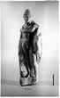 | Description: | Intact except for chip from base at proper left, and end of attribute held in left arm. Unfinished. Male figure standing on small plinth, left leg bent; nude except for a cloak looped across the chest and falling across the left arm. Long curling locks surmounted by a peaked cap. The back rough; the attributes to either side less fully worked than the figure: the right arm hangs at the side, holding drapery, or a lion's skin (?) hanging over a small pedestal. The bent left arm holds a short broad staff (?) which rests against the shoulder; lower end missing. ADDENDA Also interpreted as Castor. | |