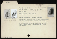 | Description: | Broken all around. Part of the back surface, dressed with toothed chisel, preserved. The upper part of a herm in low relief, apparently framed by a raised band, preserved only. Pentelic marble. | |