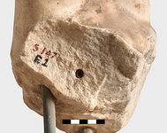 Upper part of chest preserved with front starts of neck and left arm, and 0.02m. or 0.03m. of right arm.