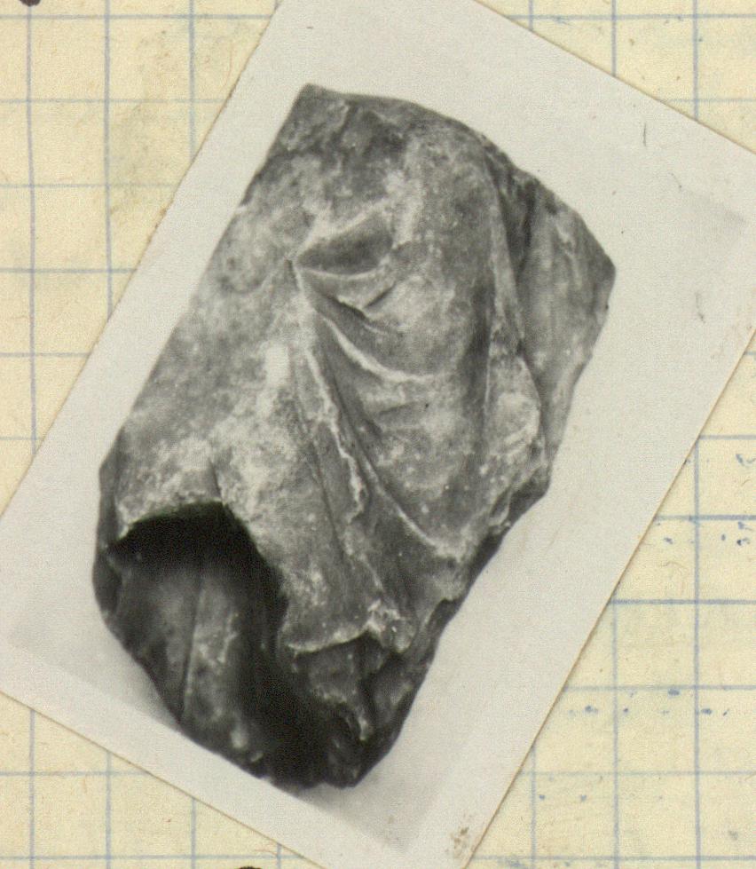 | Description: | Apparently only a portion of the front surface is preserved. To the left the remains of a seated figure; chair seat with folds of drapery from its far and right sides. To the right a drapery indicating a standing figure lifting mantle with right hand. Drapery in shallow folds. Much battered. Pentelic marble. | |