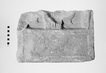 | Description: | Lower half remains, broken at top. Rough-picked back, sides and bottom preserved. Surface much worn. At bottom a plain panel framed by narrow raised bands; feet of draped figure, with vases to either side. At right end of bottom small rectangular cutting: dowel hole? Coarse grained gray marble. | |