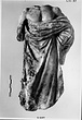 | Description: | The head and the lower edge of the himation, with the feet, missing; both were attached with pins. The right arm broken off just above the elbow; chips missing from the drapery, and a piece from the right shoulder. Standing figure, Asklepios, the weight on the left leg, the right knee bent, leaning on a staff, which rests under the right armpit. A serpent is twined around the lower part of the staff. The figure wears an himation which passes under his right arm, leaving the chest free, and is gathered in heavy folds around the bent left arm. Pentelic marble. Drilled for setting on base 1952. | |