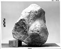 | Description: | From mid part of nude male figure, apparently in the round. Right leg held up, or forward as is seated. Small hole for peg just to left of broken right leg. Much weathered, especially at front. Island marble. | |