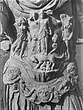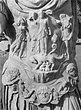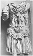 The figure wears kilt, corselet and cloak. The corselet is elaborately decorated in relief: between two Victories, Athena standing on the she-wolf; on the lappets, heads of Zeus Ammon, Apollo (?), elephant's heads and smaller ornamental motifs.