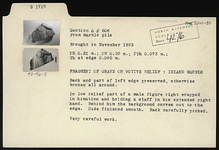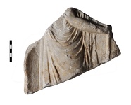 | Description: | Back and part of left edge preserved, otherwise broken all around. In low relief part of a male figure, right, wrapped in himation and holding a staff in his extended right hand. Behind him the background curves out to the edge. Side finished smooth. Back carefully picked. Very careful work. Island marble. | |