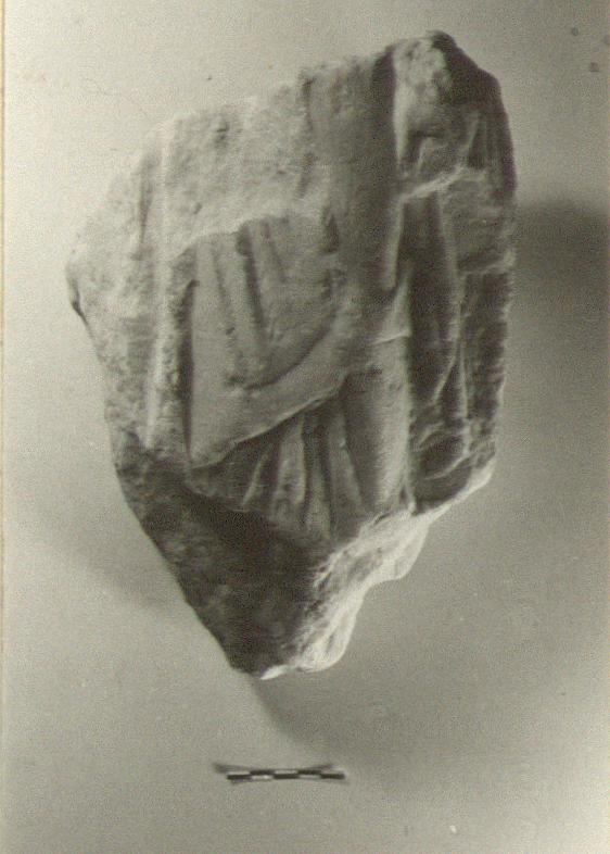 | Description: | Broken all around. Preserves very rough-picked back, and part of face with lower part of standing draped figure. Feet missing. Unfinished. Drapery roughly worked with chisel 0.007m. wide. Pentelic marble. | |