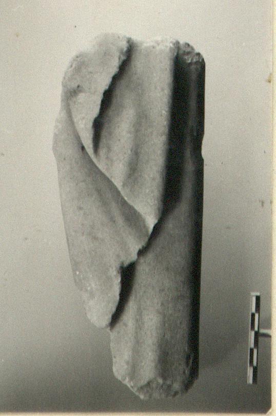 | Description: | Broken above, below and behind. Part of hanging edge of himation with zigzag folds, perhaps from a Kore. Parian marble. | |
