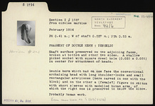| Description: | Shaft surface preserved on two joining faces, broken at bottom and other two sides. A shallow picked socket with square dowel hole in center for attachment of heads. Double herm, which had on one face the conventional archaizing head with long shoulder-locks and small rectangular arm-pieces (here carve in one with the block). On the other a (female?) figure in chiton with short sleeves with modeled human arms, of which the right one is preserved to below the elbow. Probably Roman work. Pentelic marble. From the same herm as S 1209 (Ι 1278). | |