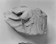 Upper part of a male figure moving right, in fairly high relief. He wears a chiton and a chlamys, which is fastened in front and blows back behind him in heavy folds.