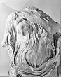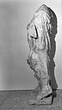 The figure is preserved from neck to plinth, so that there is no doubt about pose and movement, but one fragment which supplies the connection in the region of the thighs is interior only so that a gap appears on the surface, which has been filled out with cement. Head broken off at neck. Both forearms missing (carved separately and attached at elbows with iron dowels).