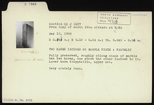 | Description: | Fully preserved. Roughly oblong chunk of marble with two herms, one above the other incised in it. Lower herm ithyphallic, upper not. Very crudely done. Pentelic marble. | |