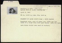 Description:   Preserves nose, part of upper jaw, right eye and cheek of a large lion with open mouth. Deep set eyes. Dark brown stains over much of surface.
