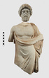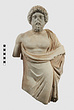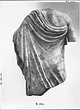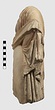 | Description: | Draped male figure (Asklepios), about one-third life-size, wearing himation which frames chest, falls lightly over legs and heavily over left arm and down left side. Right arm broken at biceps. Stub of staff preserved under right arm. Traces of bright red paint preserved on right side and back of garment and in folds. Burnt traces on left edge. White marble. Mended with S 1067. | |