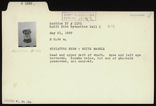 | Description: | Head and upper part of shaft. Nose and left eye battered. Broken below, but end of pinhole preserved, not centered. White marble. | |