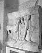 Archaistic relief. Bearded man with long hair, carrying chlamys on right arm and spear. Moves right leading pair of horses whose heads are in high relief. Very broad borders.