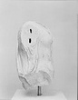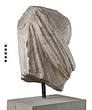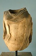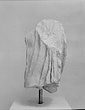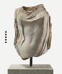| Description: | Broken at hips and on left shoulder; the thin clinging drapery is chipped. Right arm made separately: two dowel holes for attachment in rough picked surface at right shoulder. At neck, coarsely picked socket for setting in head. Slight graceful figure, about life-size. Over the thin sleeved chiton (two buttons preserved on right shoulder) was worn a himation of which only the folds at the left side, and across the back, where it is drawn diagonally, from left shoulder to right hip, remain. Pentelic marble. | |
