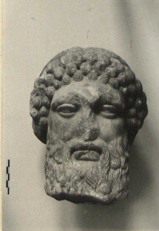 | Description: | Roughly hacked off at bottom. Broken at back. Bearded head with snail-shell curls over forehead. Fillet. Side locks broken off. Narrow eyes with overlapping upper lid. Drill hole in front. Pentelic marble. | |