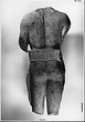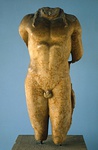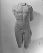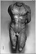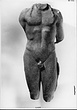 | Description: | Head, arms and legs missing. Drapery at sides broken off. Nude youthful male figure perhaps copied from a late archaic kouros. Long tresses on shoulders. A small mantle passed across the back above the hips and hung down the sides. It is rendered with very stiff, straight folds. Archaistic. Represents perhaps Dionysos. Pentelic marble. Cf. S 308 (Θ 618), small statuette of Dionysos in similar style. | |