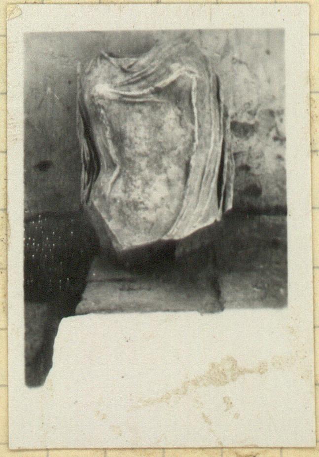 | Description: | Broken at hips and on left shoulder; the thin clinging drapery is chipped. Right arm made separately: two dowel holes for attachment in rough picked surface at right shoulder. At neck, coarsely picked socket for setting in head. Slight graceful figure, about life-size. Over the thin sleeved chiton (two buttons preserved on right shoulder) was worn a himation of which only the folds at the left side, and across the back, where it is drawn diagonally, from left shoulder to right hip, remain. Pentelic marble. | |
