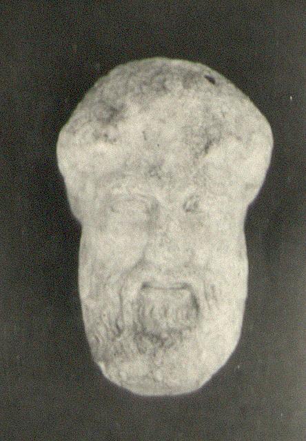 Description:   Small bearded head in the Archaic manner. Nose, end of beard, and hair above forehead chipped off. Braid round back of head, traces of locks at forehead. Left eye more highly arched than right. Broken surface at back of neck, much worn. At back of beard, two large well-marked, lateral grooves, roughly cut.