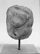 | Description: | Upper part of much damaged head, over life-size. Back of head broken away. Remains of close set eyes and upper part of nose; spreading ears. Front hair waved, bordered at brow by row of flat ringlets. Pentelic marble. Drilled for setting on base 1950. | |