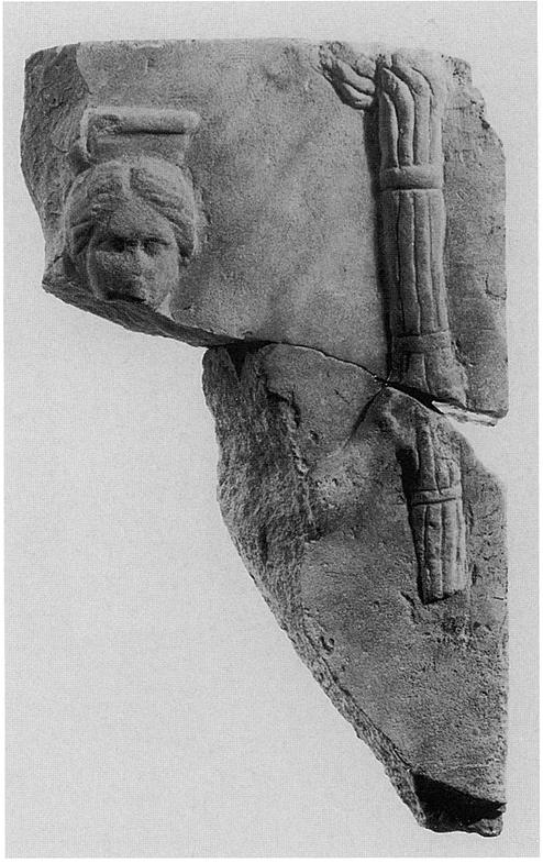 | Description: | Upper right hand corner of stele. At left woman's head facing front, hair parted in middle and wearing polos. Torch at right. Hymettian marble. Joins S 1614 ( Τ 1280). | |