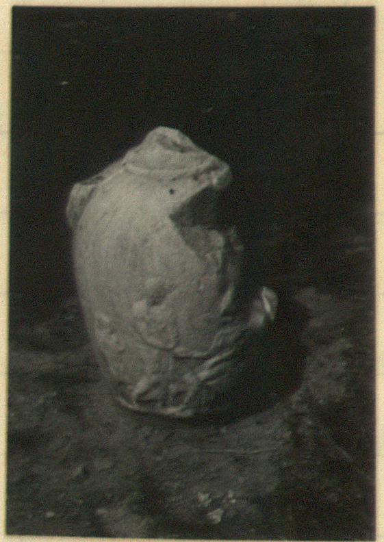 | Description: | Foot, neck and handles missing and a large chunk broken out of right side of body. Much worn. In relief four figures. Standing man shaking hands with seated woman, behind each, a small standing figure. White marble. | |