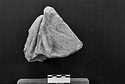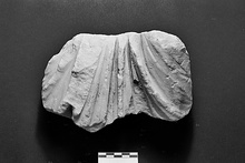 | Description: | Broken all around, but bottom edge of a few folds preserved. Draped shin to mid-calf; heavy folds. The fabric is gathered toward the center in heavier folds. The figure is about one-third life-size and might be part of deep relief rather than in the round. In this connection note the flange jutting out from the side of the thigh. From grave relief of Isis. Pentelic marble. ADDENDA Initially interpreted as part of a thigh, and the marble as perhaps Parian. | |