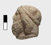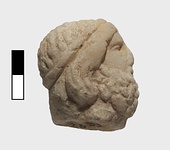 | Description: | Miniature head, broken at neck. Intact, tip of nose missing only, and surface worn. Figure is heavily bearded, hair is long, parted in center, wavy in top and bound with a fillet. Possibly broken from a miniature herm. Pentelic marble. | |
