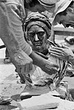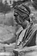 Long strands of hair, parted in middle, pulled down and back over ears. Hair in back bound in a thick coil. She wears a thick fillet tied at the back, and a wreath. Eyebrows defined with lightly incised strokes; frown lines between brows. Large drilled pupils. Dimpled chin. Deep broad lines below eyes and around mouth. Thick neck, receding chin. Light undergarment with heavier wrap over shoulders, tied in front. Large molded base. No inscription. Face and neck somewhat polished.