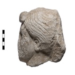| Description: | Broken at neck and behind. Very battered and worn, Female head. Roll of hair over forehead, pulled back in a braid at top; sides combed back in long strands. Details of face mostly worn away. The letters Θ Σ carved on forehead. Crystalline white marble. | |