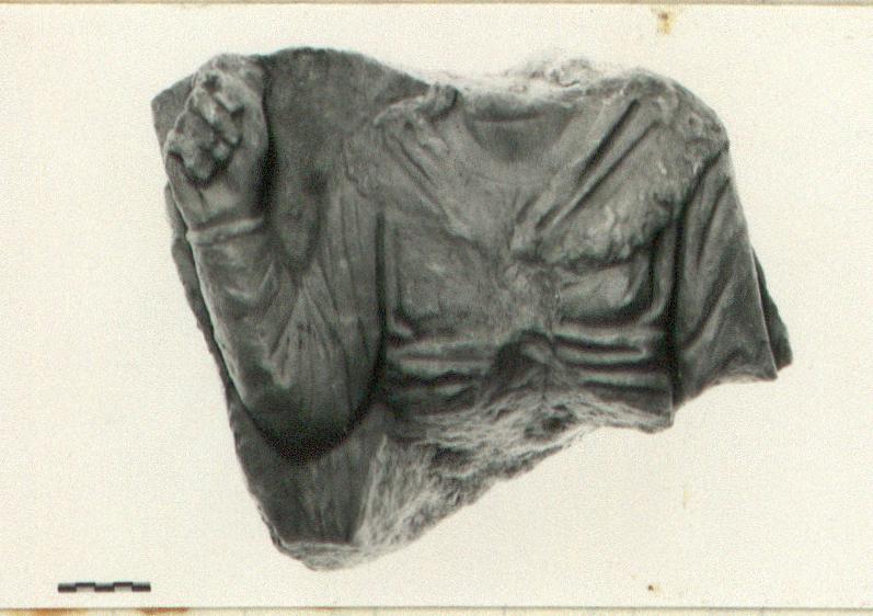 | Description: | Broken all around. Back surface rough but probably original. Front scarred in places. Figure broken at neck and arm. Figure in sleeved chiton with himation (?) over main part of body with hairy or furry border around neck, horizontal drapery at arm. Right arm bent and raised at elbow. Hand grasping some objects. Long tresses of hair on shoulders. Heavy rasp work, generally flat appearance, but deep drill work in areas. Pentelic marble. | |
