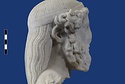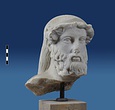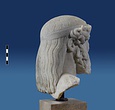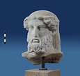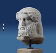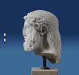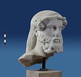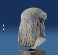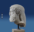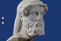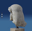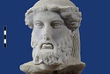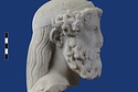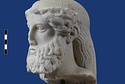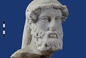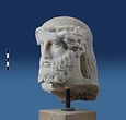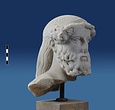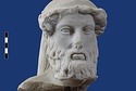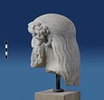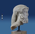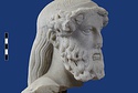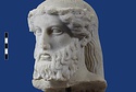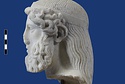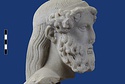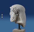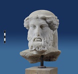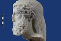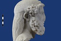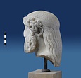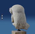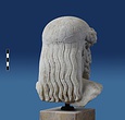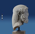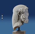 | Description: | Broken at neck, preserving part of socket of right arm. Tip of nose broken. Lower lip replaced, probably ancient repair during carving. Bearded. Long hair in waves from face and circulating from crown long in back. Stephane held with thin cord at back. Large crystal white marble. | |