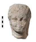 Female head turned slightly to her right. A bit of the relief background preserved at right. Chubby face with heavy eyelids. Ear only summarily worked out. Two Venus rings on neck.