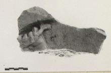| Description: | Broken on all sides. Palm of hand shown gripping inside strap of shield. Thumb and first joint of fingers missing. Shield has concave inner surface with flat edge around outer rim. Front of shield is curved with half round near its outer edge. Parts of sculpture preserved, carved full round. White marble. | |
