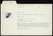 | Description: | Broken all around. Piece from bottom of cuirass with parts of two decorated tabs. Right one shows eagle facing front, wings down but open, head turned to its left; left one shows strands of hair, face itself lost. Crystalline white marble. Perhaps same as S 2515 (ΡΡ 459) and S 2517 (ΡΡ 461). Joined to S 2503. | |