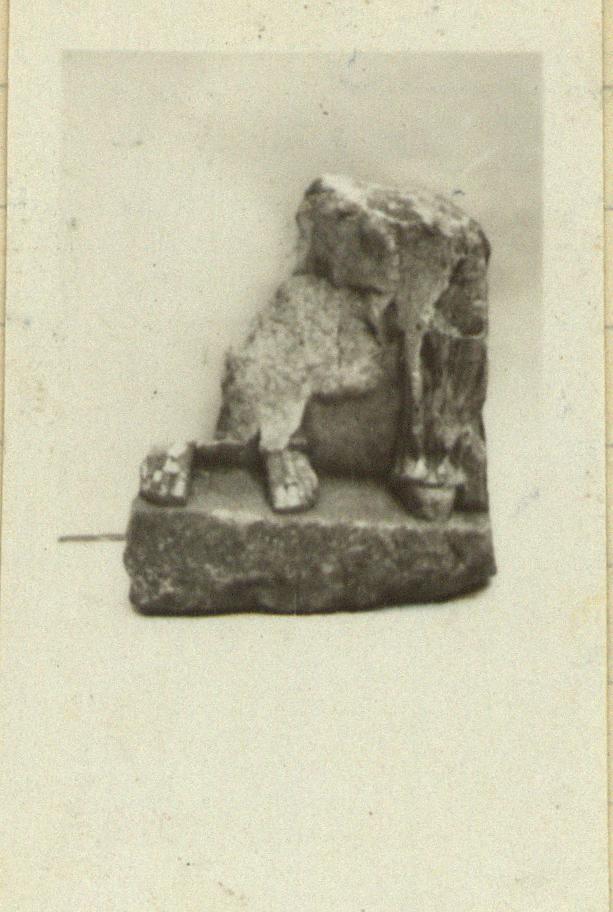 | Description: | Rough-picked back surface and bottom preserved; at the back, the lowest 0.10m. is cut back for a depth of ca. 0.045m., as if for setting in a base. Two sandaled feet are preserved to the left, to the right, the lower leg and right foot of a figure wearing a long chiton. Pentelic marble. Cf. S 259 (Η 40). | |