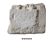 Description:   Roman grave relief with thick base and smooth finished right side. Of the relief the feet and lower drapery folds are preserved. The deeply drilled folds of the chiton have a central cluster and the cloth catches over her shoes. She stands with left foot forward and right back. The back of the relief is rough-picked; the right side very smooth. The thick base has been rough-picked and has graffiti.