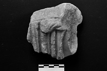 Description:   Fragment of right shoulder covered by Isis shawl (four narrow folds preserved), one long lock curled on shoulder and narrow arc of smooth-surface of flesh at neck, are preserved. No drilling of lock of hair. Rasped finish to shawl, the folds of which vary in width and depth. Line of drill along top of shoulder separated relief of figure from slab of background. Narrow wedge of background, all broken, remains.