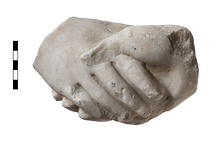 Description:   Two clasped right hands, slightly larger than life-size, broken at wrists and behind lower and slightly larger hand (where once attached to relief).