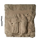 Description:   Broken at right. Top, bottom and left sides irregularly preserved. Back originally rough-picked but smoothed from reuse. Original relief ground chipped away on edges, particularly at top.